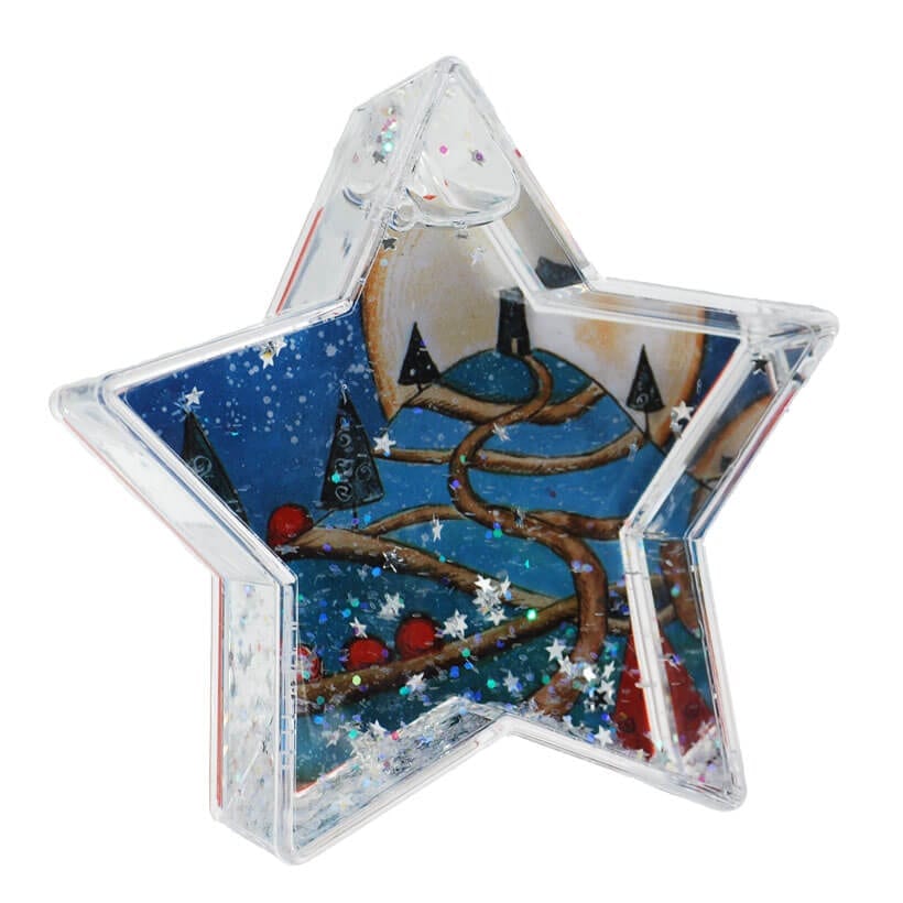 Happy Glastonbury's own take on the snow globe! This cute little acrylic star measures approximately 10cm in diameter and features our festive happy art images. Tiny silver stars and pearlised iridescent dots provide the snow effect. A great stocking filler idea!