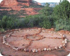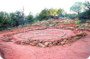 A Medicine Wheel may take many forms. It could be constructed like a piece of artwork that you sit or meditate on. I have seen beautiful quilts done like this. It could be a physical construction in the landscape. There are many stones circles across the globe. Smaller more personal sets of crystals can be carried in a pouch. Medicine wheel circles could be made of any material. I have seen some made of colored sand, herbs and flowers that when the ceremony is finished are scooped up and buried with offerings.